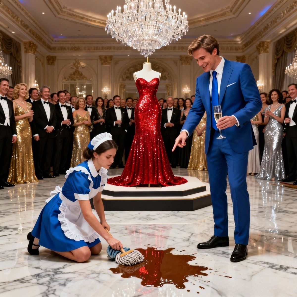 The hotel’s grand ballroom glittered with chandeliers and golden walls as Clara, a humble cleaning lady, nervously held her broom. She’d endured ridicule from guests for five years, but that night was different. Alejandro Domínguez, the city’s most sought-after young millionaire, noticed her after she accidentally spilled water near his guests. Mocking her, he pointed to a red ball gown and said, “I’ll marry you if you fit into this dress.” Clara’s cheeks burned, tears welling up, but something stronger than sadness stirred inside her.